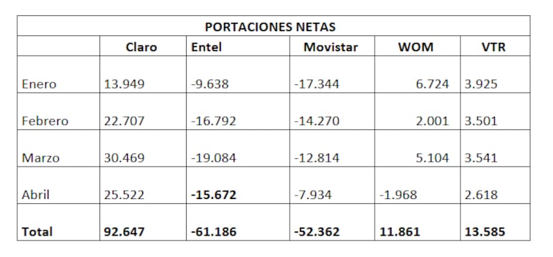Según el informe publicado por la Subsecretaría de Telecomunicaciones (Subtel), la compañía sumó 92.647 nuevas portaciones netas entre enero y abril de este año, a las que se suman, las 13.585 obtenidas por VTR, que es parte de la misma compañía.