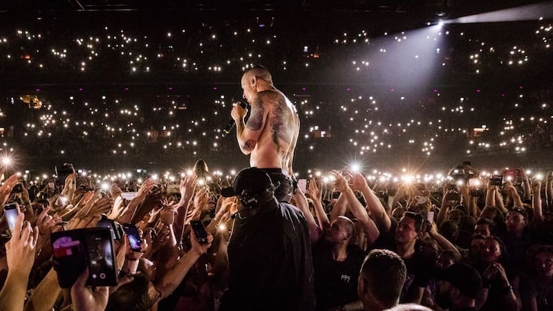 "Quiero que miren a la persona que está al lado suyo y que le digan que la aman, que están felices de que esté con ustedes esta noche disfrutando de un buen momento, escuchando música, celebrando la vida", dice Chester mientras se baja del escenario y se acerca al público. En medio de sus fans, a quienes toma de las manos con afecto, canta por última vez esa canción.