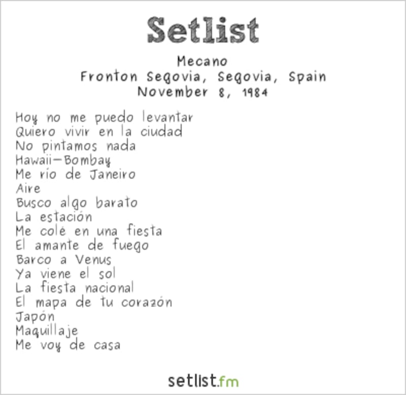 Aquel recital comenzó con "Hoy no me puedo levantar". Acompañando a Ana Torroja y los hermanos José María e Ignacio Cano (estos repartiéndose teclados e instrumentos de cuerda), estaban Arturo Terriza (batería) y Esteban Cabezos (bajo). Con esa formación, Mecano tocó 14 canciones. Eso hasta que llegó la número 15, "Japón", momento en el que ingresaron dos músicos a escenario.