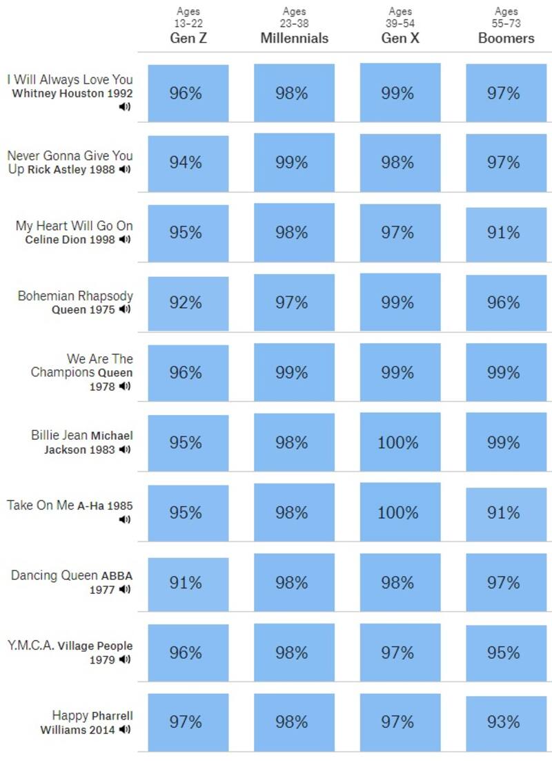 Y hay más sorpresas, como que, más allá de que solo los Boomers reconozcan universalmente "I Say A Little Prayer" de Dionne Warwick (1967), solo los Gen X consideren como una canción clave a "Roam" de B-52's (1990), o solo los Millenials amen "Confessions Part II" de Usher (2004), hay un listado (pequeño) de temas que pasan de generación en generación y son reconocidas por todo el mundo.