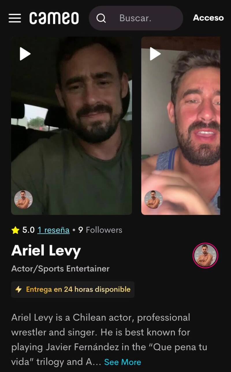 Levy cobra cerca de $12.000 por un saludo de “uso personal”, mientras que asciende a $89.316 cuando se trata de empresas. En él se presenta como actor de la trilogía Qué pena tu vida y alude a su rol en The green inferno, la cinta de Eli Roth producida por López.