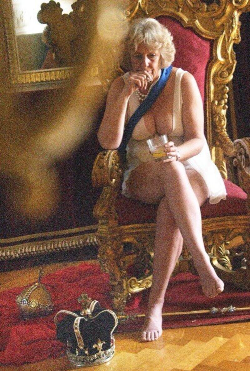 Una peculiar foto de Camilla Parker Bowles, la reina consorte de Inglaterra, estuvo dando vueltas por internet luego que se diera a conocer la muerte de la Reina Isabel II. En la imagen, se ve, supuestamente, a la esposa del Rey Carlos III sentada en el trono, con ropa interior, tomando un trago y fumando un cigarro, mientras la corona reposa en el piso.