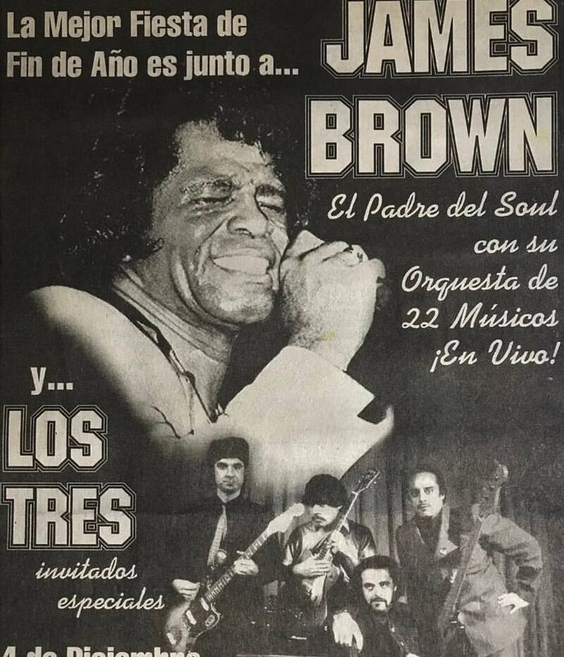 “La mejor fiesta de fin de año es junto a… James Brown, el padre del soul con su orquesta de 22 músicos ¡en vivo!... y Los Tres, invitados especiales”, rezaba el afiche promocional del encuentro. “Es una emoción, un hito tocar con alguien como él”, admitía el cantante de los chilenos en declaraciones al diario La Nación, en la previa de la cita.