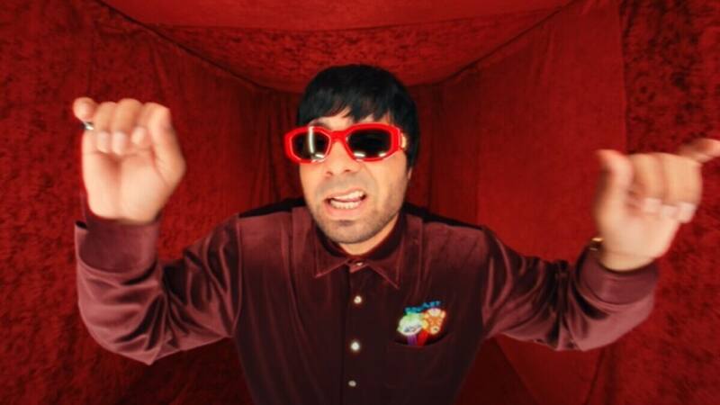 Lentes de sol color rojo, chaqueta plateada y el micrófono como último accesorio. El cantante de 45 años retrocede en el tiempo, mostrando una estética muy similar a la que se veía en sus primeros años en la industria.