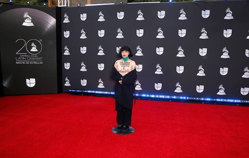 Mon Laferte hizo lo suyo en la alfombra roja de los Grammy Latinos de 2019. Durante el estallido social, la artista se volvió una voz en favor de las demandas sociales, apoyo que materializó rápidamente con su canción Pla ta tá (2020). En la alfombra roja de la ceremonia de premios, la artista viñamarina se descubrió el pecho para que se leyera el siguiente mensaje: “En Chile torturan, violan y matan”. Sobre su cuello, además, descansaba un pañuelo verde a favor de la legalización del aborto libre y seguro.