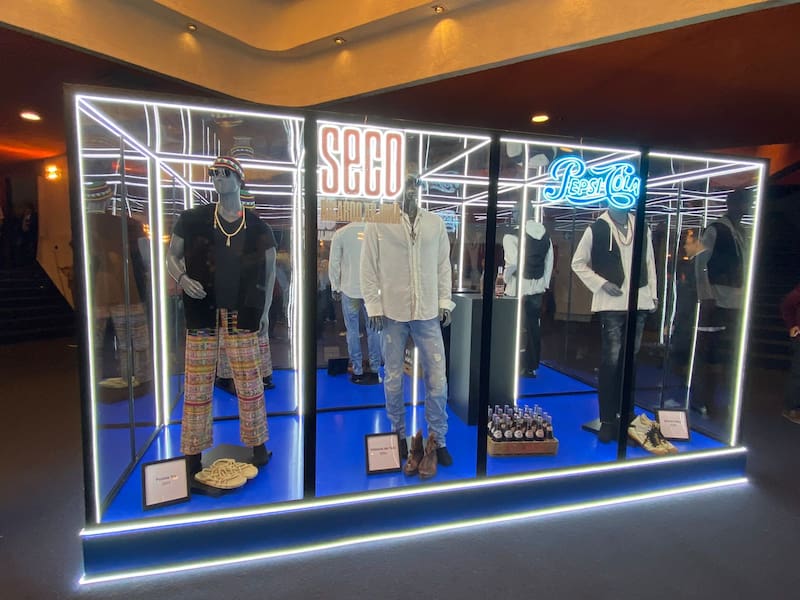 En un salón contiguo al teatro aparece un telar que en tiempo real diseña productos relativos a Arjona, mientras que una vitrina exhibe los distintos looks ocupados en cada una de sus giras a partir de los años 90: si The Beatles intentó sintetizar sus fases creativas a través de vestuarios distintivos, el hombre de Dime que no propone lo mismo con su propio curso del calendario. Ahí están las botas café en punta y los jeans rasgados de Historias de taxi (1994), a la par con las sandalias y el colorido hippie de Fuiste tú (2011).