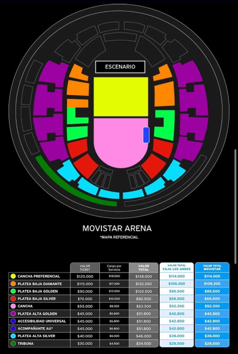 Los precios van de $34.500 (tribuna) a $138.000 (cancha preferencial). Incluye cargo por servicio.