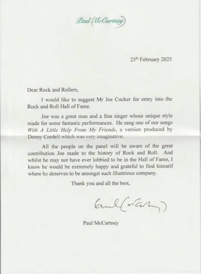 En su mensaje, McCartney dijo lo siguiente: “Me gustaría sugerir al señor Joe Cocker para su ingreso al Salón de la Fama del Rock and Roll”.