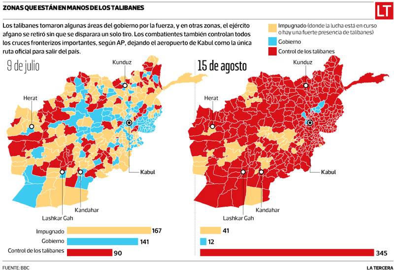 En julio de 2021, el grupo controlaba casi el 54% de los distritos afganos, según la Foundation for Defense of Democracies Long War Journal. Sin embargo, apenas unos meses antes alcanzaba a sólo el 20%.