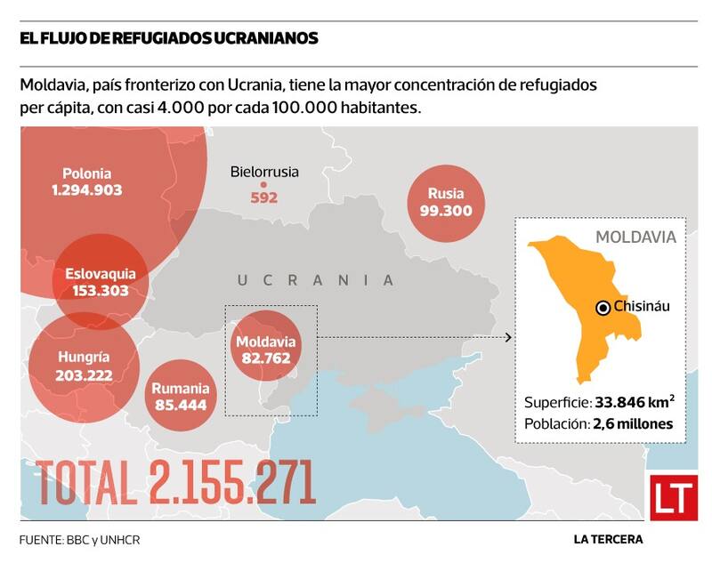 Desde que estalló la invasión rusa a Ucrania, Moldavia es uno de los territorios seguros para los miles de ucranianos que huyen cada día de la violencia. En una superficie de tan solo 33 mil kilómetros cuadrados y con 2,6 millones de habitantes, el país fronterizo cercano a la asediada ciudad de Odesa se ha convertido en destino para 82 mil refugiados. Se trata de la mayor concentración per cápita en Europa, con 4.000 asilados por cada 100 mil habitantes.