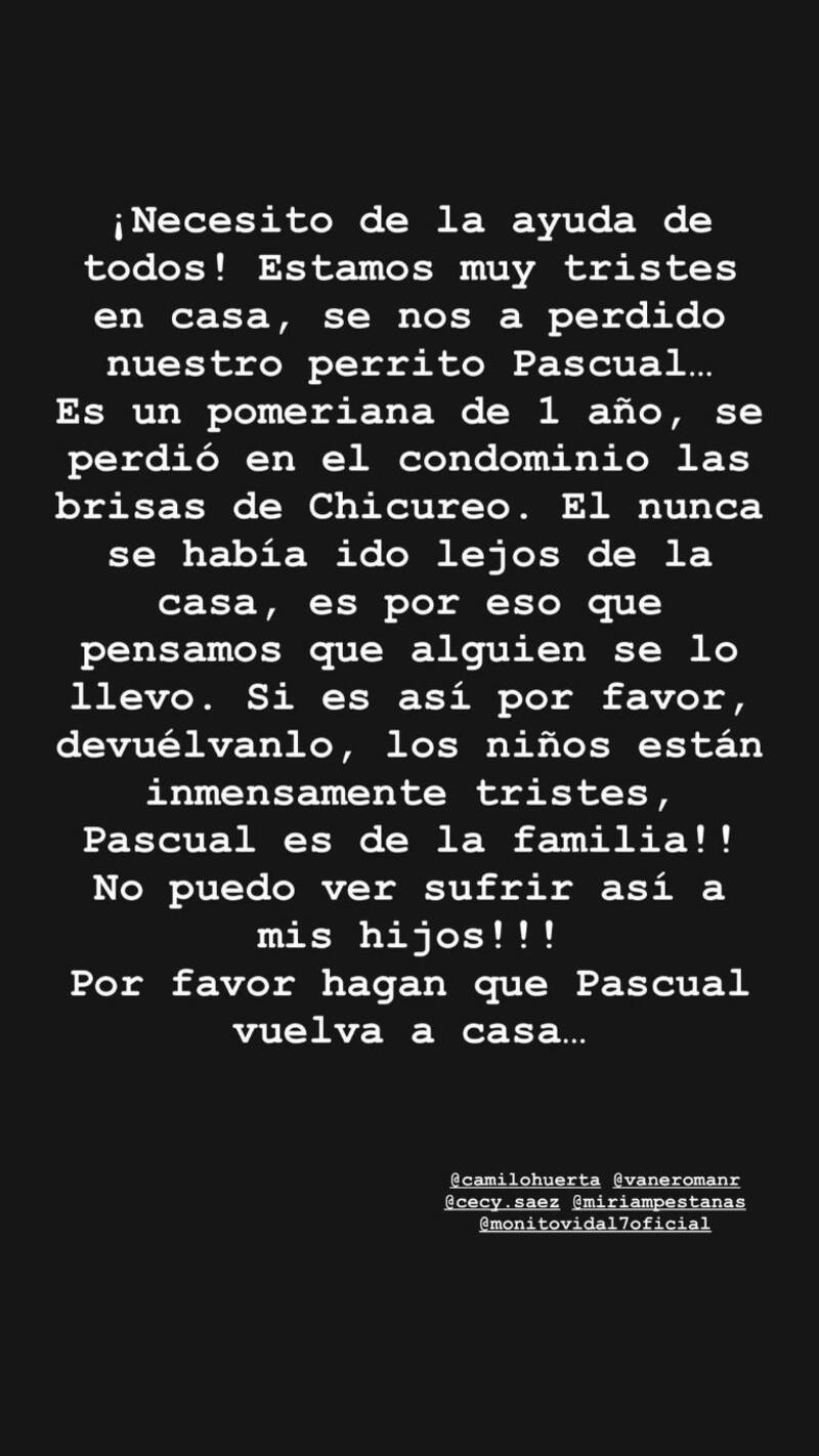 La información fue compartida también por María Teresa Matus, ex esposa del futbolista. En su Instagram, la influencer escribió que: “¡Necesito de la ayuda de todos! Estamos muy tristes en casa, se nos ha perdido nuestro perrito Pascual”.
