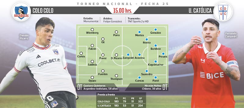 El Cacique revitalizó su candidatura al título tras boletear a Cobresal, el líder de la competencia. Ahora la misión de los pupilos de Gustavo Quinteros es ratificar esa actuación, una de las mejores del año. La mala noticia en Pedrero es que Carlos Palacios será baja, tras lesionarse en Calama, en el duelo ante Cobreloa por las semifinales de la Copa Chile. Colo Colo iniciará el partido ante la UC a siete puntos de los mineros, que jugarán después ante Palestino.