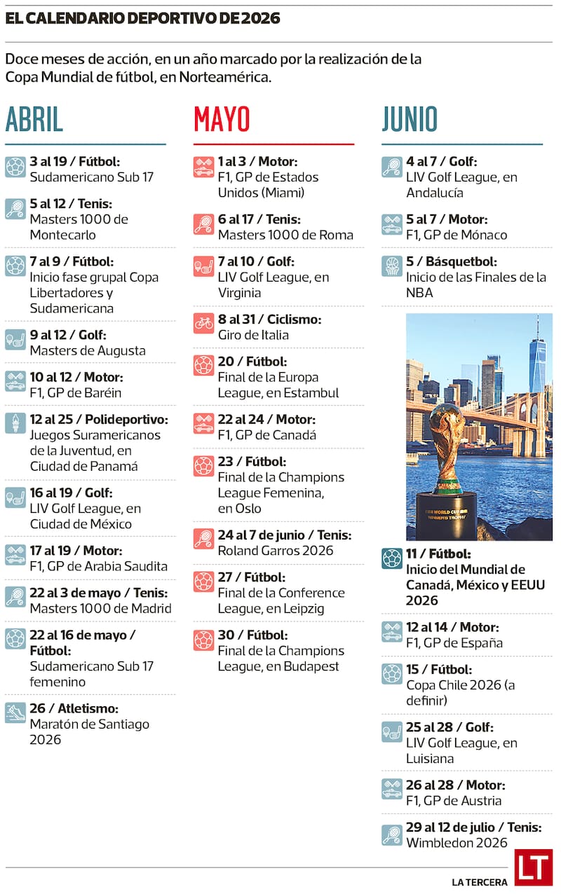 El año que está comenzando presenta una cuantiosa cartelera de eventos, en todas las disciplinas. La Copa del Mundo de Norteamérica, con 104 partidos entre junio y julio, es la cita que aparece subrayada con destacador. El polideportivo también presenta desafíos para las cartas del Team Chile.