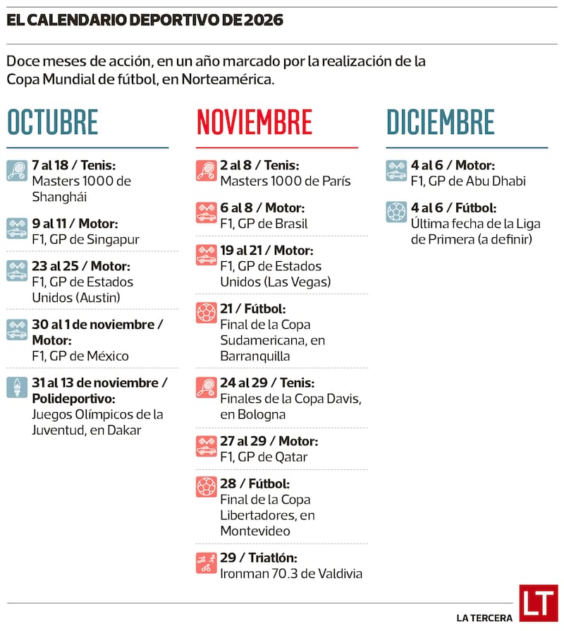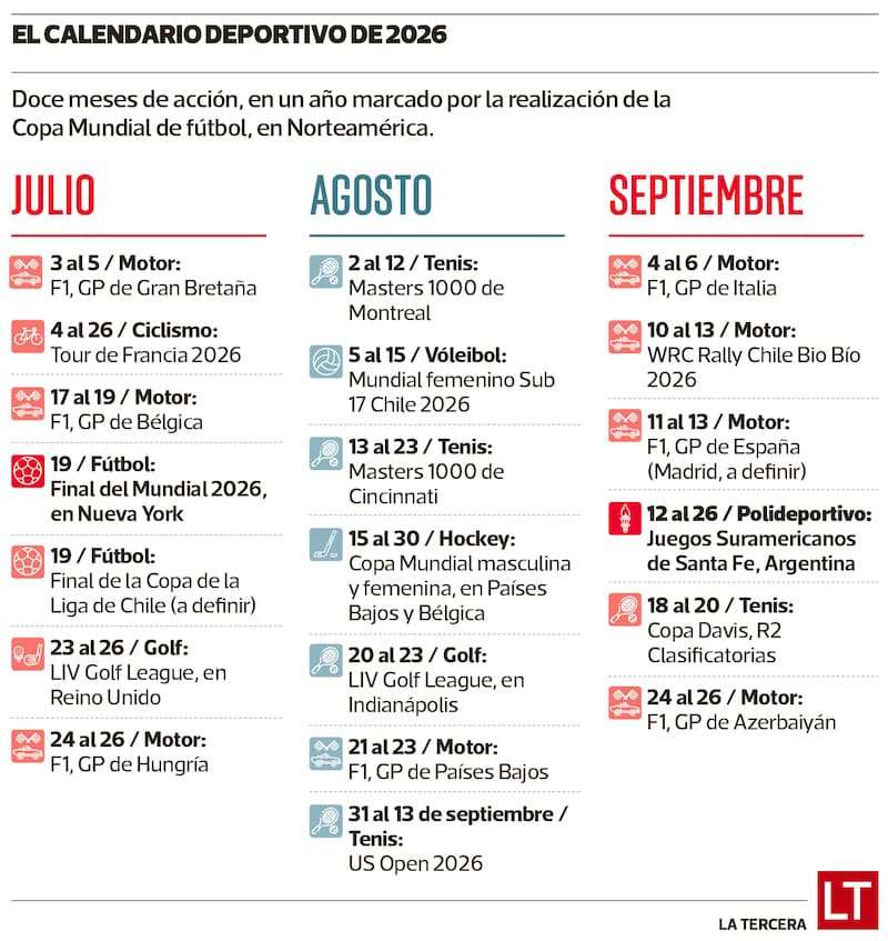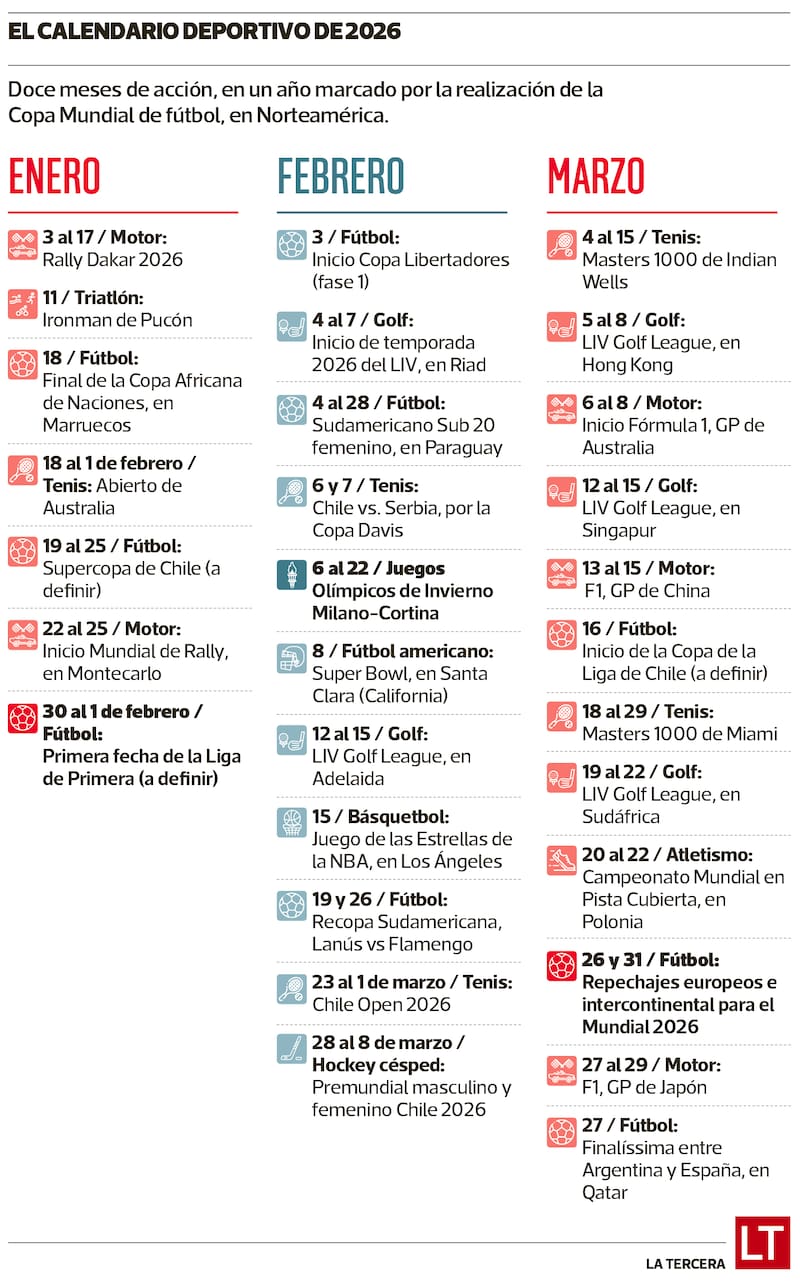 Llegó el 2026. El año que está empezando trae consigo una serie de eventos deportivos que tendrán la atención de los fanáticos, en todas las disciplinas y en todas las latitudes. En la siguiente nota se hace un repaso con el nutrido calendario de las competencias que animarán los 12 meses (ver infografía, más abajo). Inevitablemente, será un año especial. Porque hay Mundial.