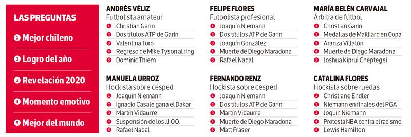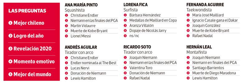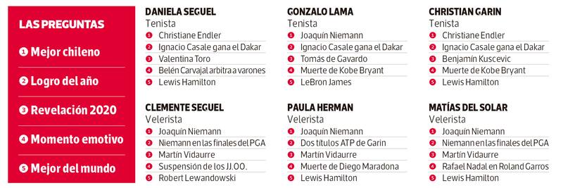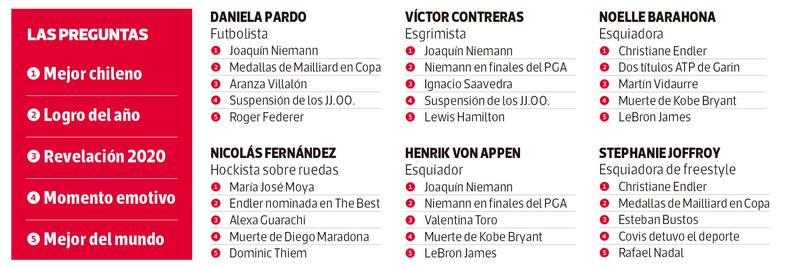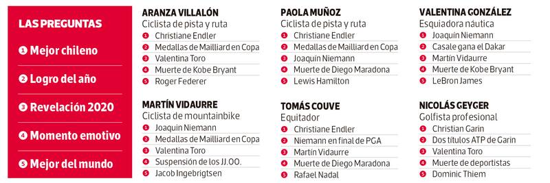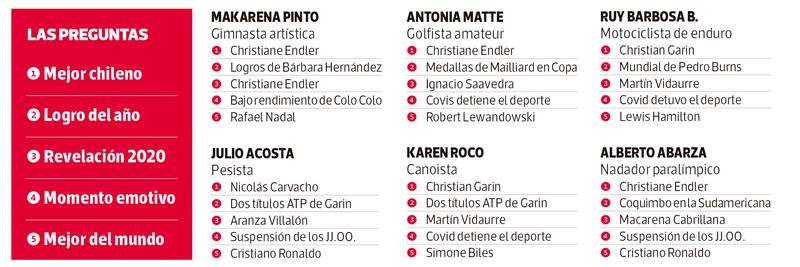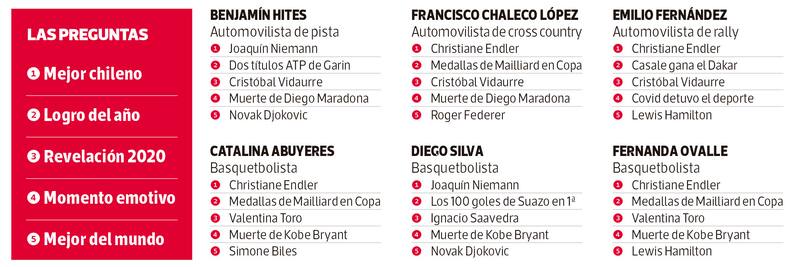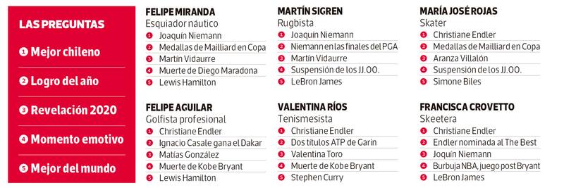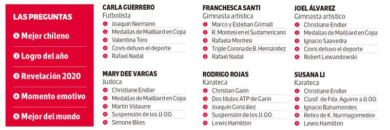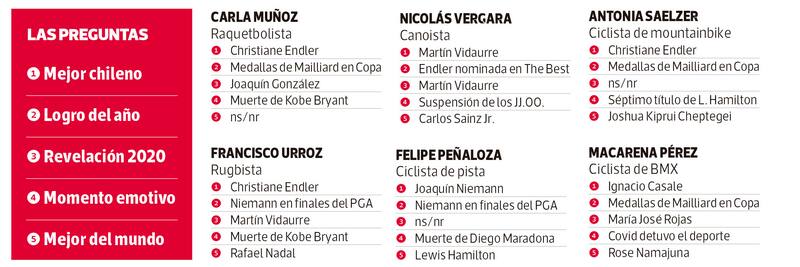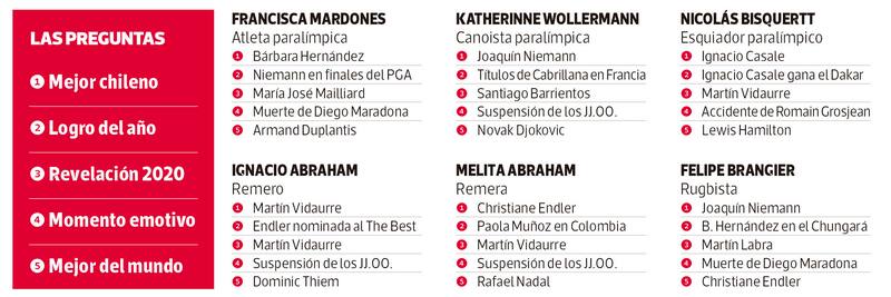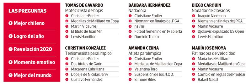 En un año difícil, 100 deportistas destacaron la constancia de Mailliard en la obtención de sus medallas, las emocionantes carreras de Lewis Hamilton en Fórmula Uno y la sorprendente temporada 2020 de Martín Vidaurre, un joven que parece no ponerse límites. Y, cómo no, reconocieron la mezcla de emociones que les produjo la suspensión de los Juegos Olímpicos por culpa de la pandemia.