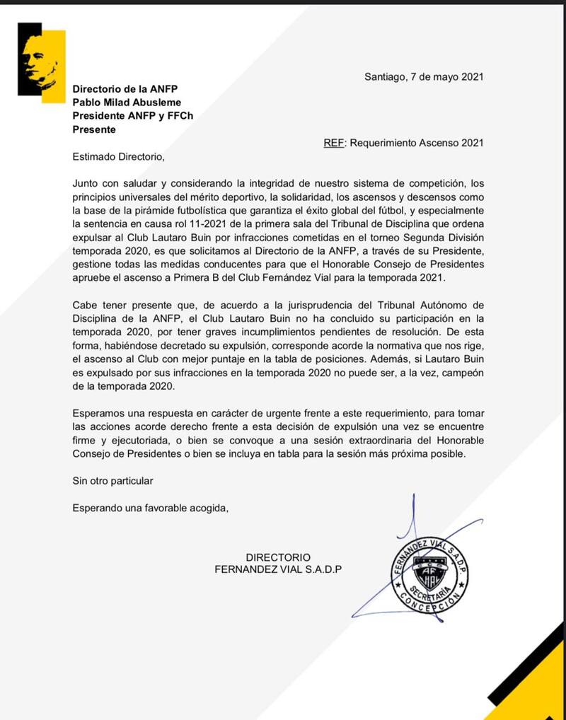 “Estimado Directorio, Junto con saludar y considerando la integridad de nuestro sistema de competición, los principios universales del mérito deportivo, la solidaridad, los ascensos y descensos como la base de la pirámide futbolística que garantiza el éxito global del fútbol, y especialmente la sentencia en causa rol 11-2021 de la primera sala del Tribunal de Disciplina que ordena expulsar al Club Lautaro Buin por infracciones cometidas en el torneo Segunda División temporada 2020, es que solicitamos al Directorio de la ANFP, a través de su Presidente, gestione todas las medidas conducentes para que el Honorable Consejo de Presidentes apruebe el ascenso a Primera B del Club Fernández Vial para la temporada 2021″, comienza diciendo.