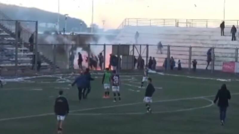Antes del pitazo final, una batalla en las galerías provocó la suspensión. Se registraron lanzamientos de bengalas de un sector a otro, peleas a golpes y agresiones. El árbitro Gastón Bustamante determinó el término anticipado del partido. Luego, a las afueras del reducto, fueron apuñalados un fanático menor de edad y el padre de uno de los futbolistas.