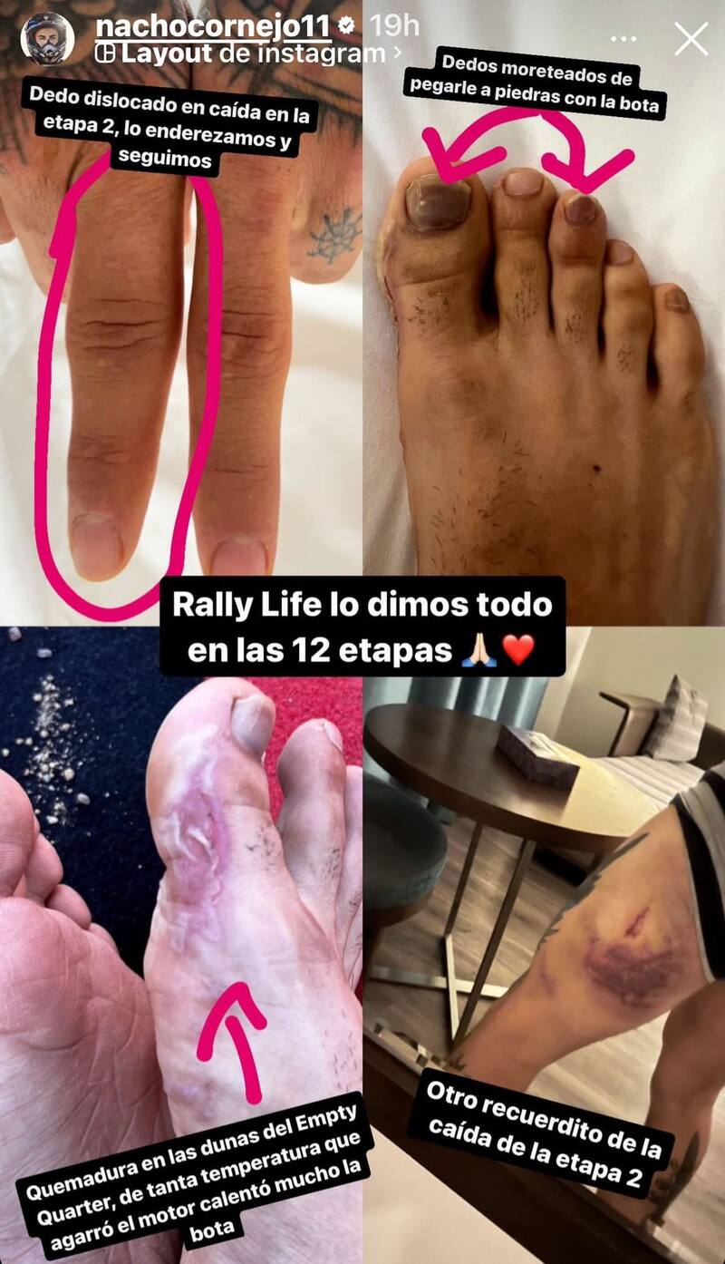 “Dedo dislocado en la caída de la etapa 2, lo enderezamos y seguimos”, “Dedos moreteados de pegarle a piedras con la bota”, “Quemadura en las dunas del Empty Quarter, de tanta temperatura que agarró el motor calentó mucho la bota” y “Otro recuerdito de la caída en la etapa 2″, escribió como acompañamiento de las impactantes fotografías.