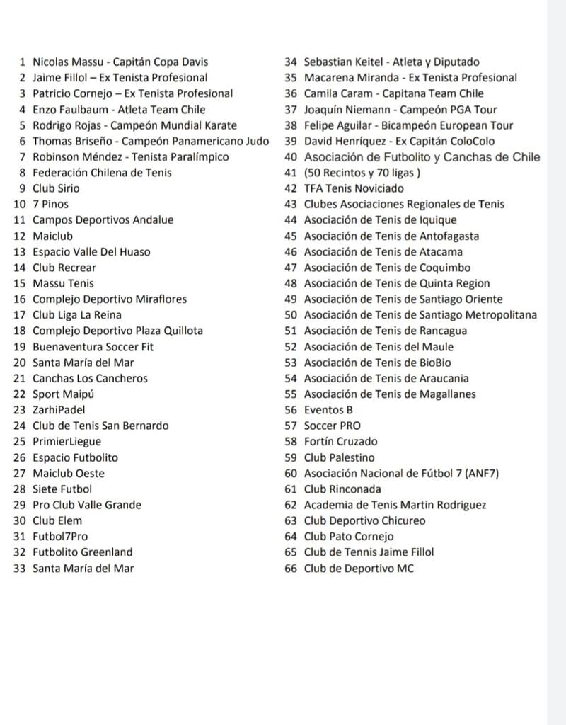 La misiva está firmada por figuras de la talla de Nicolás Massú, Joaquín Niemann, Sebastián Keitel, Rodrigo Rojas, Thomas Briceño, Camila Caram, Robinson Méndez, Jaime Fillol, Felipe Aguilar, David Henríquez y Macarena Miranda, además de organizaciones como la Federación de Tenis de Chile y otras asociaciones regionales.