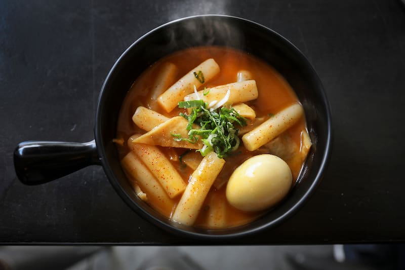 También el Tteokbokki ($ 5.000), un caldo concentrado y picante, que viene con un huevo, masas de pescado y de arroz, como los dok bok ki, que tienen una textura similar a los ñoquis de arroz, y forma alargada.