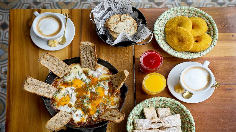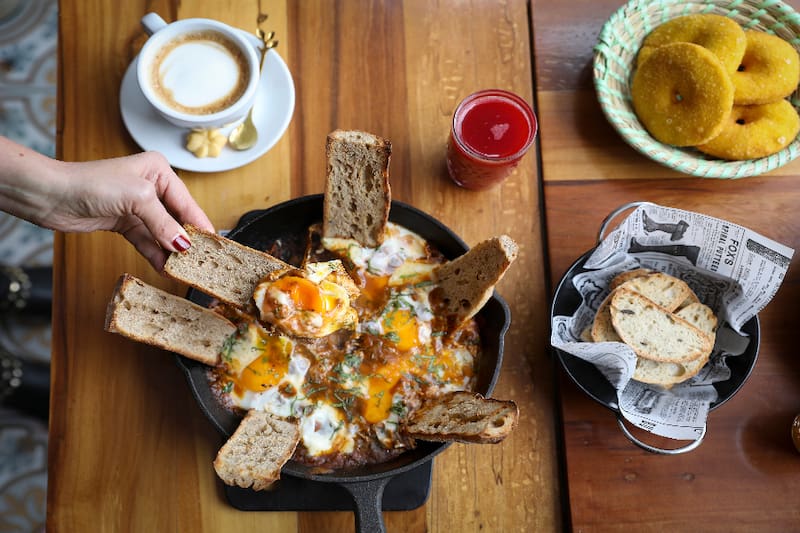 También puedes tentarte con el brunch y pedir Shakshuka ($ 16.900 para dos personas), una deliciosa paila de huevos con salsa de tomates casera, que viene con pan de masa madre para untar y dos cafés a elección.