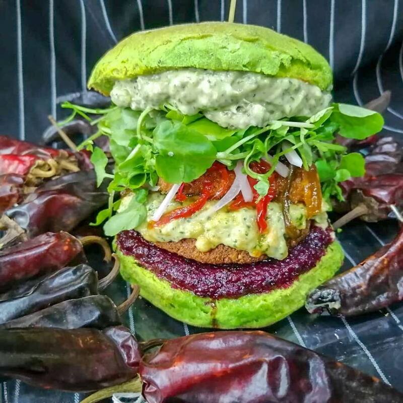 Y si buscas una vegana, entonces tu elegida debe ser la psicodelic burger ($ 7.990), con croqueta de garbanzos con especias de la india, tofu apanado, mermelada de pimientos, cebolla morada, hummus de betarraga, lactonesa de hierba buena, salsa de ají merquen y berros, en pan de pesto albahaca y cilantro.