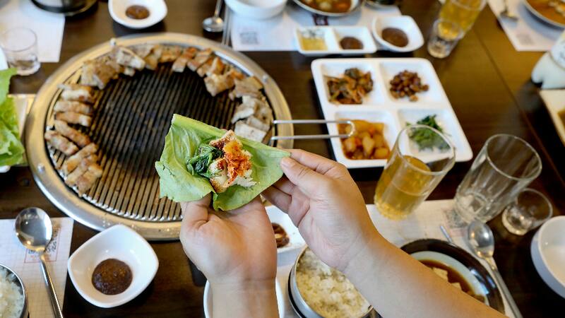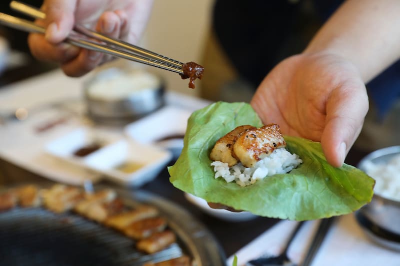 Es decir, usas las hojas de lechuga como base y a eso le agregas arroz, la carne, más un toque de salsa y la parte del banchan que elijas. El resultado es un bocado fresco, sabroso, delicioso.