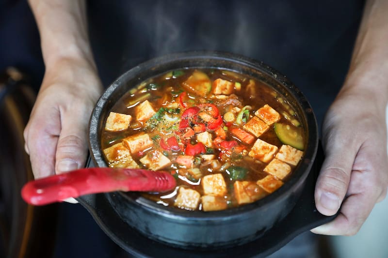 Al igual que platos veganos como los japchae ($ 8.000), fideos de camote de textura muy suave, salteados con verduras y hongo oreja, con soya y aceite de sésamo; y el dolsot bibimbap ($ 8.500), que es una fuente de greda de arroz caliente con distintas verduras.