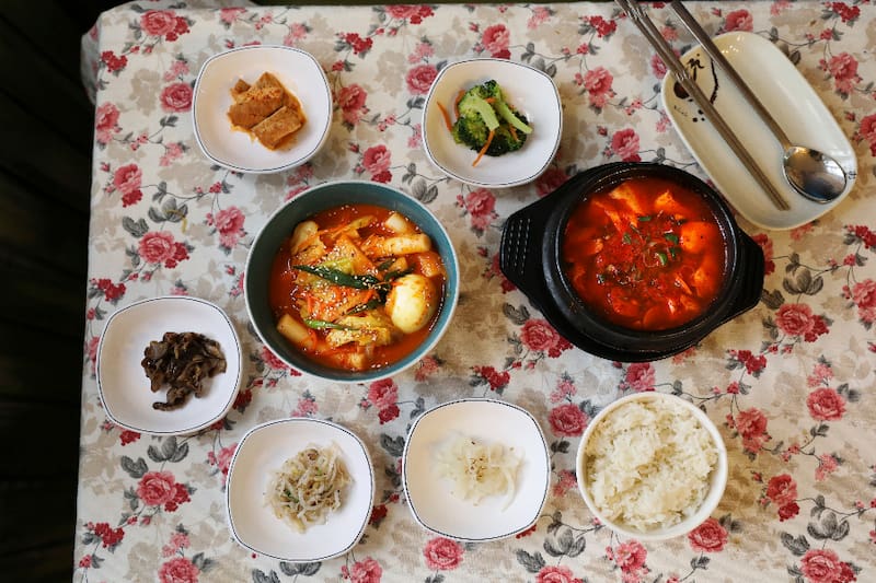 Todos acompañados de banchan, seis pequeñas porciones que se ponen en el centro de la mesa y que pueden ser kimchi, brócoli con pasta de ají o nabos encurtidos, por ejemplo.