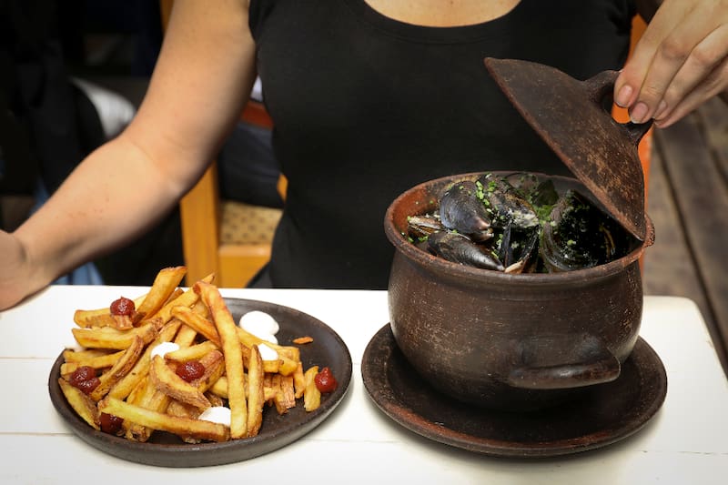 Y, que puedes acompañar de entradas como los Moules Frites ($ 15.000) que es una gran olla de choritos cocinados en crema y salsa verde, que vienen acompañados de papas fritas con alioli y ketchup casero; o el Hummus ($ 11.500), de garbanzos, con encurtidos de nabos, zanahoria, cebolla morada y tomates cherry.
