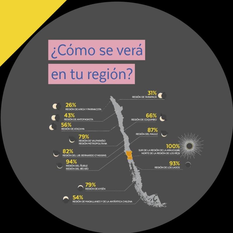 De esa forma, los mejores lugares para apreciar este eclipse solar 2020 serán las ciudades que están en el sur de la Araucanía y al norte de Los Ríos, como Pucón, Villarrica, Panguipulli, Licán Ray, Temuco, Gorbea y Teodor Schmdith, entre otras.