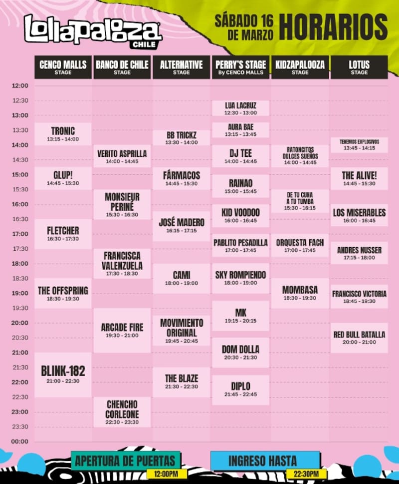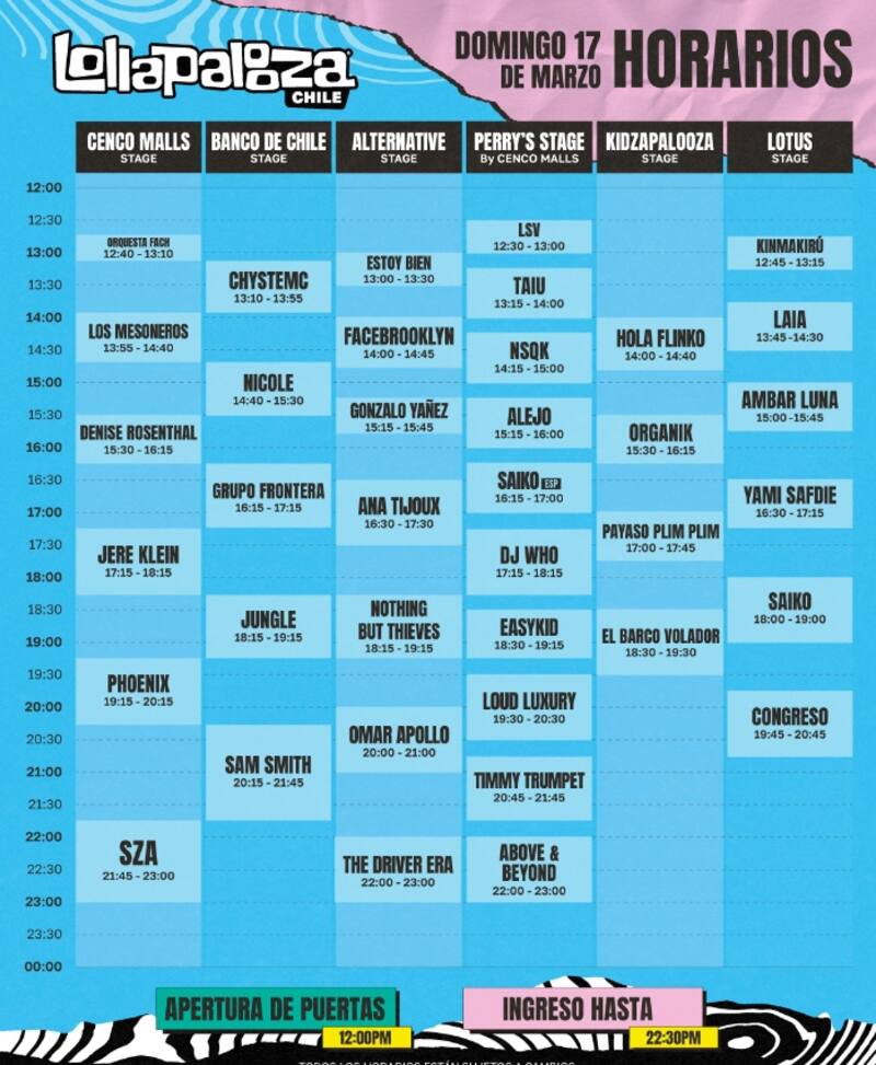 Puedes ver a continuación la programación con los horarios por día y escenario de Lollapalooza Chile 2024.
