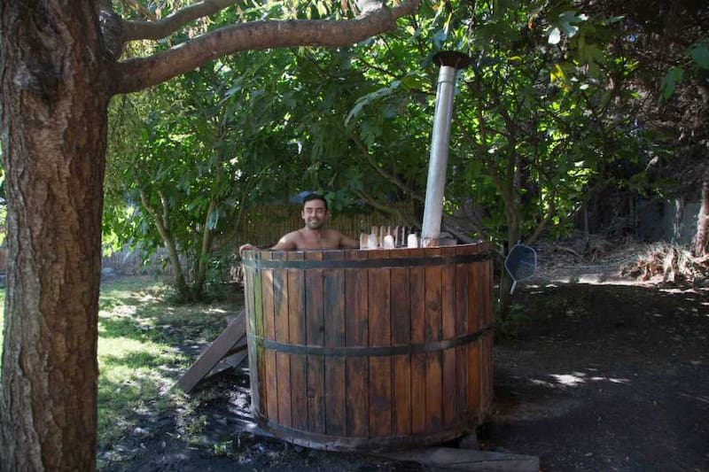 Al atardecer, nada mejor que meterse a un hot tub debajo de un almendro y de una higuera para cerrar los ojos y olvidarse del estrés.