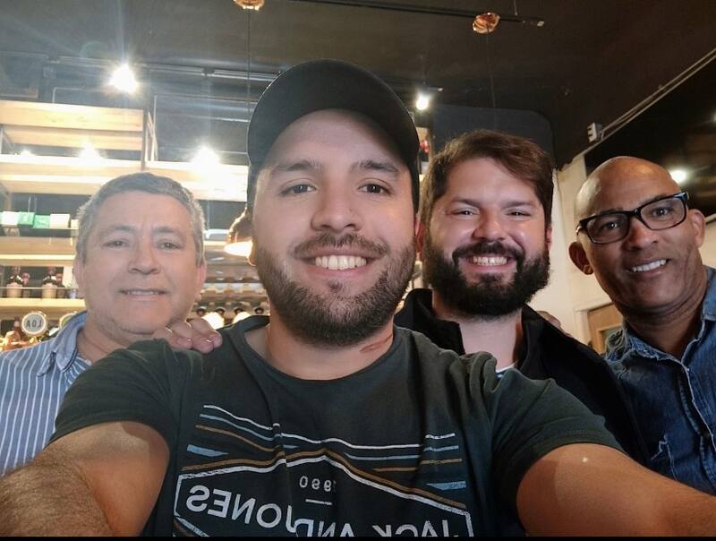 En la foto Gabriel Boric en El Patio Esmeralda junto a Julio (primero a la izquierda), dueño del bar
