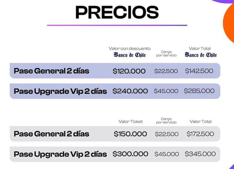 ¿Y cuáles son los precios? Van desde $ 142.500 (cargo por servicio incluido) del pase de dos días con descuento Banco de Chile, hasta los $ 345.000 del pase upgrade vip de dos días.