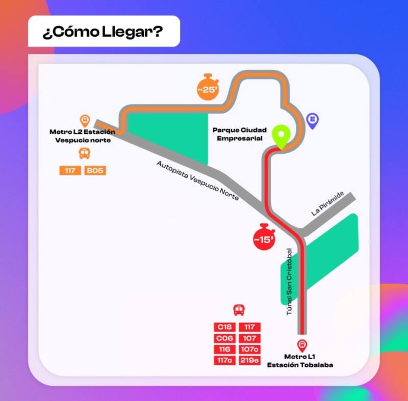 Para llegar tienes varios recorridos de buses del sistema RED, que puedes tomar desde la estación de Metro Vespucio Norte o desde la estación Tobalaba.