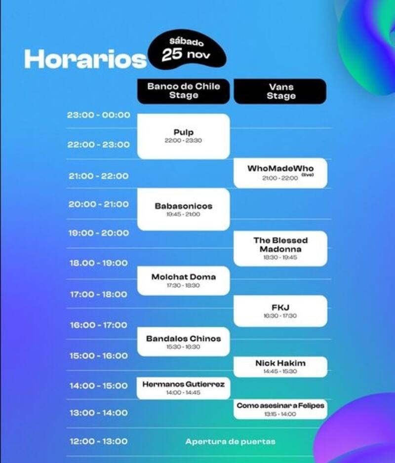 En tanto, el sábado la apertura de puertas será a las 12 PM, día en que Pulp y Babasónicos serán los protagonistas de la cita.