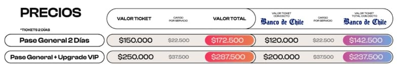 De hecho, la venta parte este viernes 9 de agosto al mediodía con una preventa exclusiva para clientes del Banco de Chile y con los pases generales para dos días.