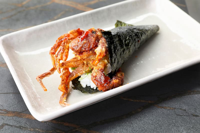 Antes de pasar directamente a los temakis, como el spicy ($ 7.000), que es un conito de alga con relleno de tártaro de salmón spicy; o el kani picante ($ 18.500), el mismo conito relleno de soft-shell crab, similar a la jaiba, en salsa karami, japonesa levemente picante, cebollín y takuan, encurtido japonés.