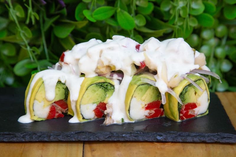 Otra opción son los olivo roll ($ 5.700), que vienen rellenos de palta, tomate y tofu, envueltos en palta y cubiertos de una salsa de aceitunas y alcaparra, o los ceviche roll ($ 5.700), con champiñón furai y palta, envueltos en ciboulette, con una salsa de ceviche y acevichada vegana.