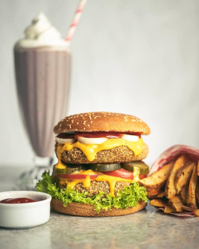 Además, te puedes tentar con los sánguches, como el chucuchen ($ 5.990), que es una hamburguesa de porotos negros, cebolla morada, lechuga, brotes de alfalfa, tomate y palta; o la Upa-la lá ($ 6.850), una doble hamburguesa de lentejas con quinoa, queso cheddar, tomate, salsa española, pepinillos y lechuga.