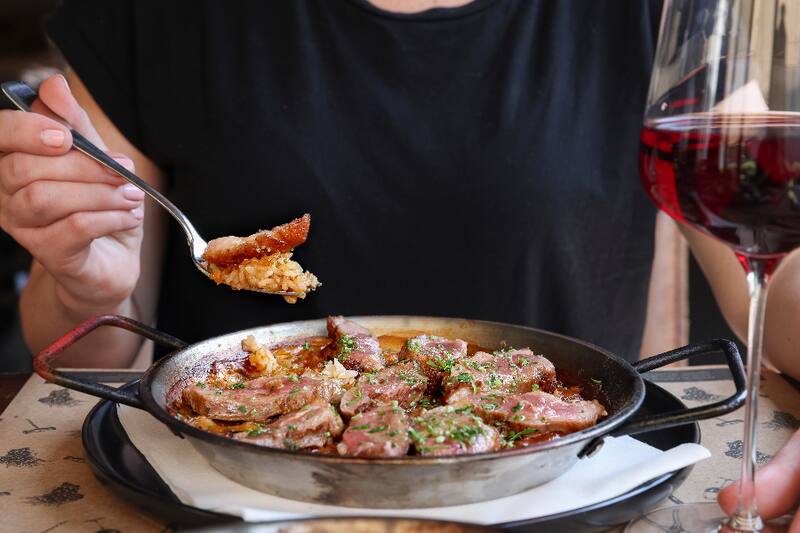 No se ve desde la calle, pero tiene una amplia terraza interior y una carta de vinos con 30 opciones por copa, nacionales y extranjeras. Además de tapas, perfectas para compartir. Ojo con las paellas, para dos como la de Magret con todo el sabor del juguito de esa carne tierna.