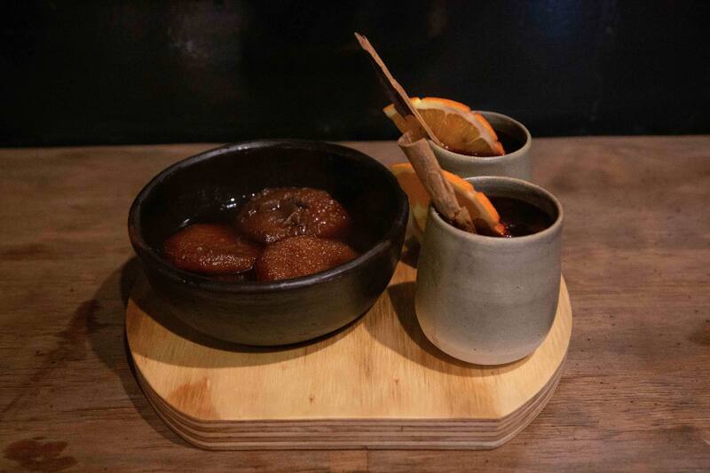 Lo prepara en el momento el bartender Carlos Díaz, y lo hace con vino tinto y un toque de ron, al que le echan cardamomo, estrella de anís, canela, eucalípto y naranja deshidratada.