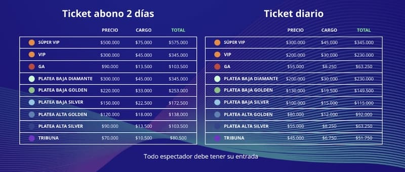 Los precios de la entradas diarias cuestan desde $ 51.750, mientras que el pase para los dos días va desde los $ 80.500.