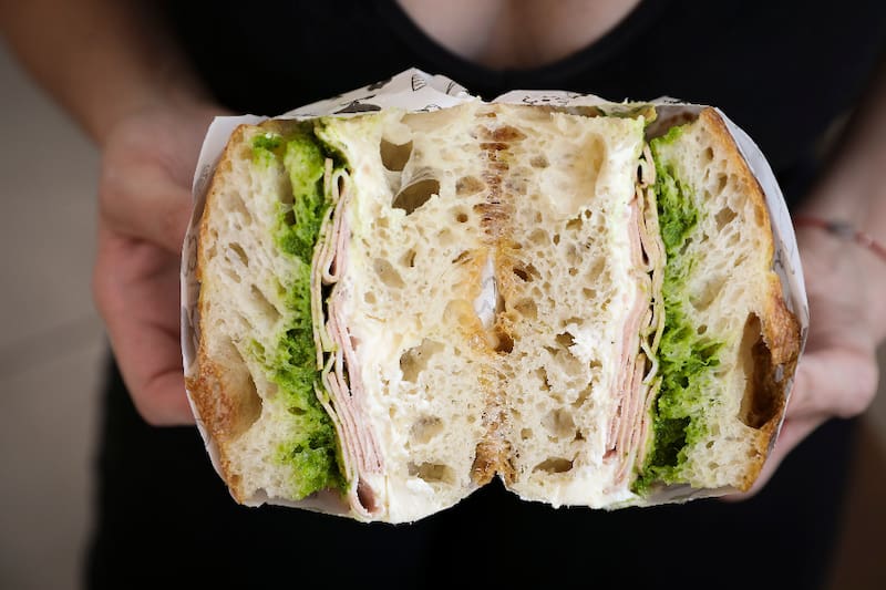 De hecho, todo se hace ahí mismo, incluso el pan, que usan en sus sándwiches, como el de Pesto y ricotta ($ 7.500), que es una deliciosa focaccia, con pesto de albahaca ricotta, pimentón asado, berenjena y zapallo italiano grillado.