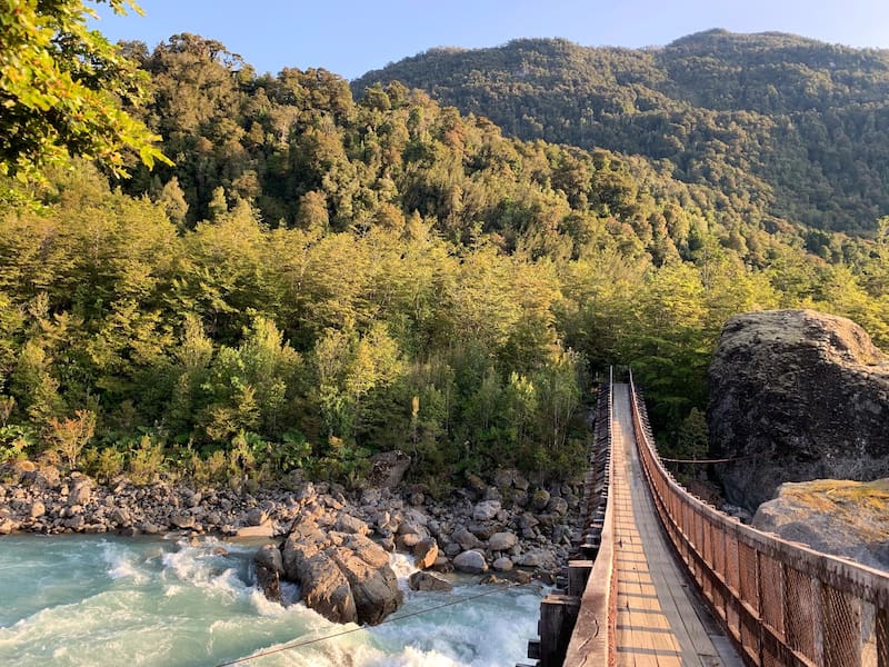En este sector del parque hay 5 senderos, tres de ellos de dificultad baja y dos de dificultad moderada. Pasamos un puente colgante para aventuramos primero en el que lleva hacia la Laguna, para después retroceder unos metros y empezar el más largo, 6,6 kms de ida y vuelta, que termina en el mirador del Ventisquero.