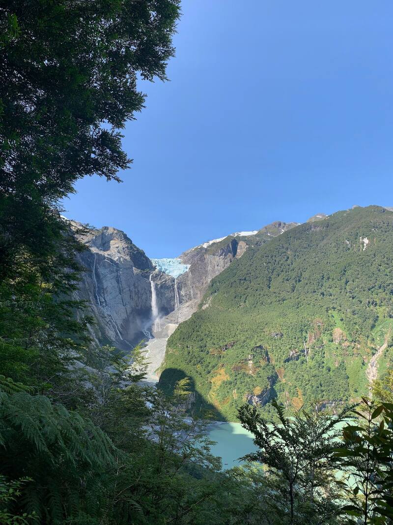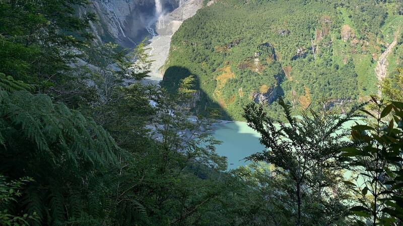 A medida que avanza el camino, se hace cada vez más fuerte un ruido constante, que pareciera ser una carretera. Una vez en el mirador, el sonido ya invade todo. Son las cascadas que caen desde el Ventisquero, dejando una estela blanca que pareciera caer en cámara lenta.