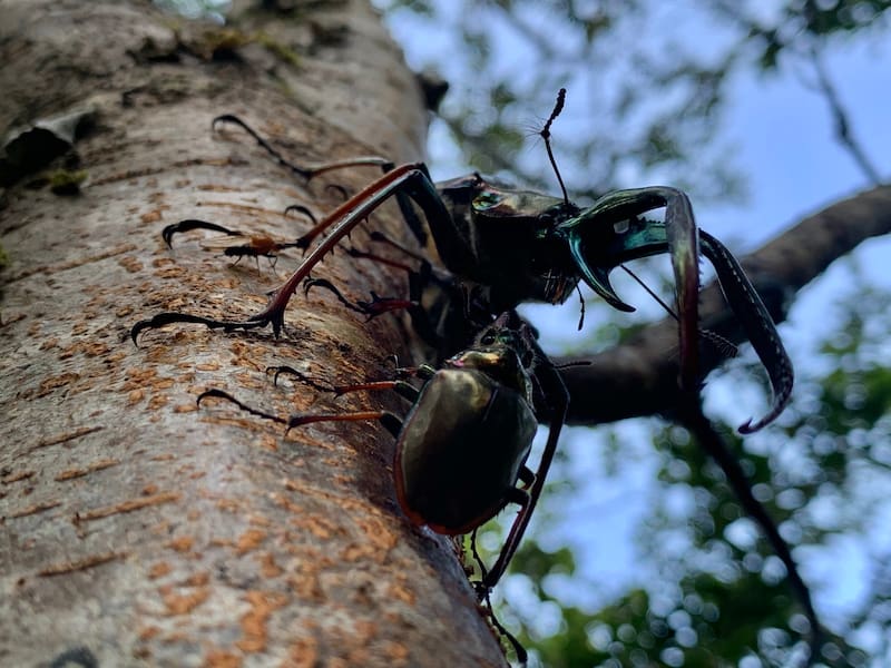 Nos encontramos también con estas cantabrias o escarabajos de darwin machos, con sus caparazones tornasol y sus enormes tenazas que usan para botarse de los árboles unos a otros, donde el ganador trepa hasta encontrarse con una hembra.