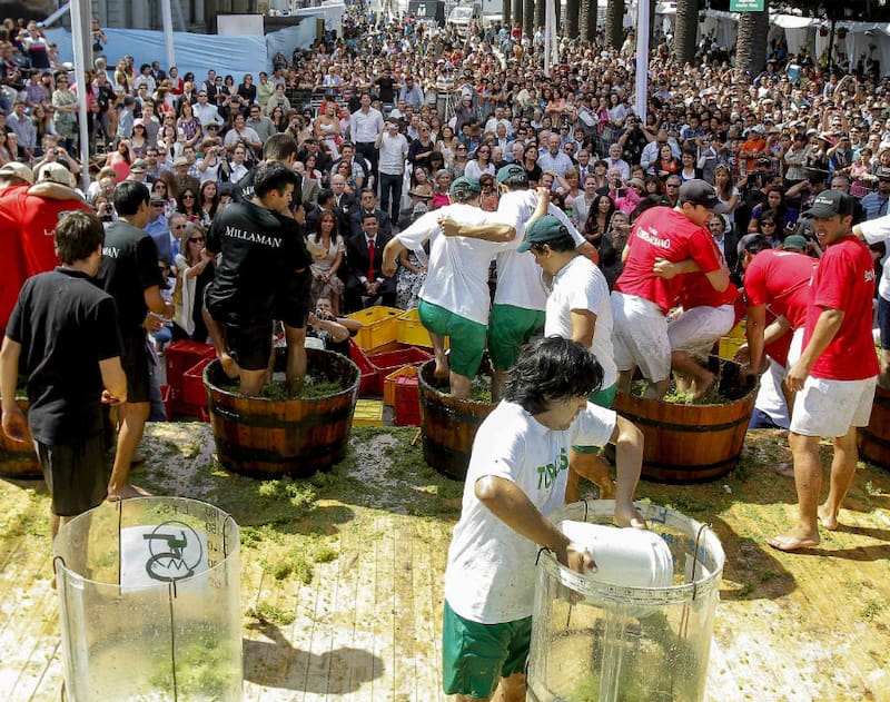 Pero la actividad más esperada es la pisada de uva, una competencia que instauró en Chile esta fiesta en 1986. Distintos equipos de las diferentes viñas, en unas inmensas tinajas de madera, se empeñan en producir la mayor cantidad de mosto con sus pies en el menor tiempo posible.