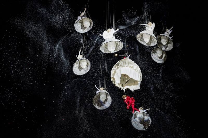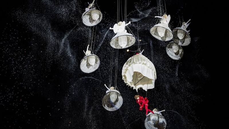 Desde Bélgica llega este hermoso espectáculo que recrea una fiesta de unión de una pareja donde todos bailan y vuelan para celebrar el amor. Están rodeados de buena compañía: músicos y criaturas como salidas de cuentos de hadas.